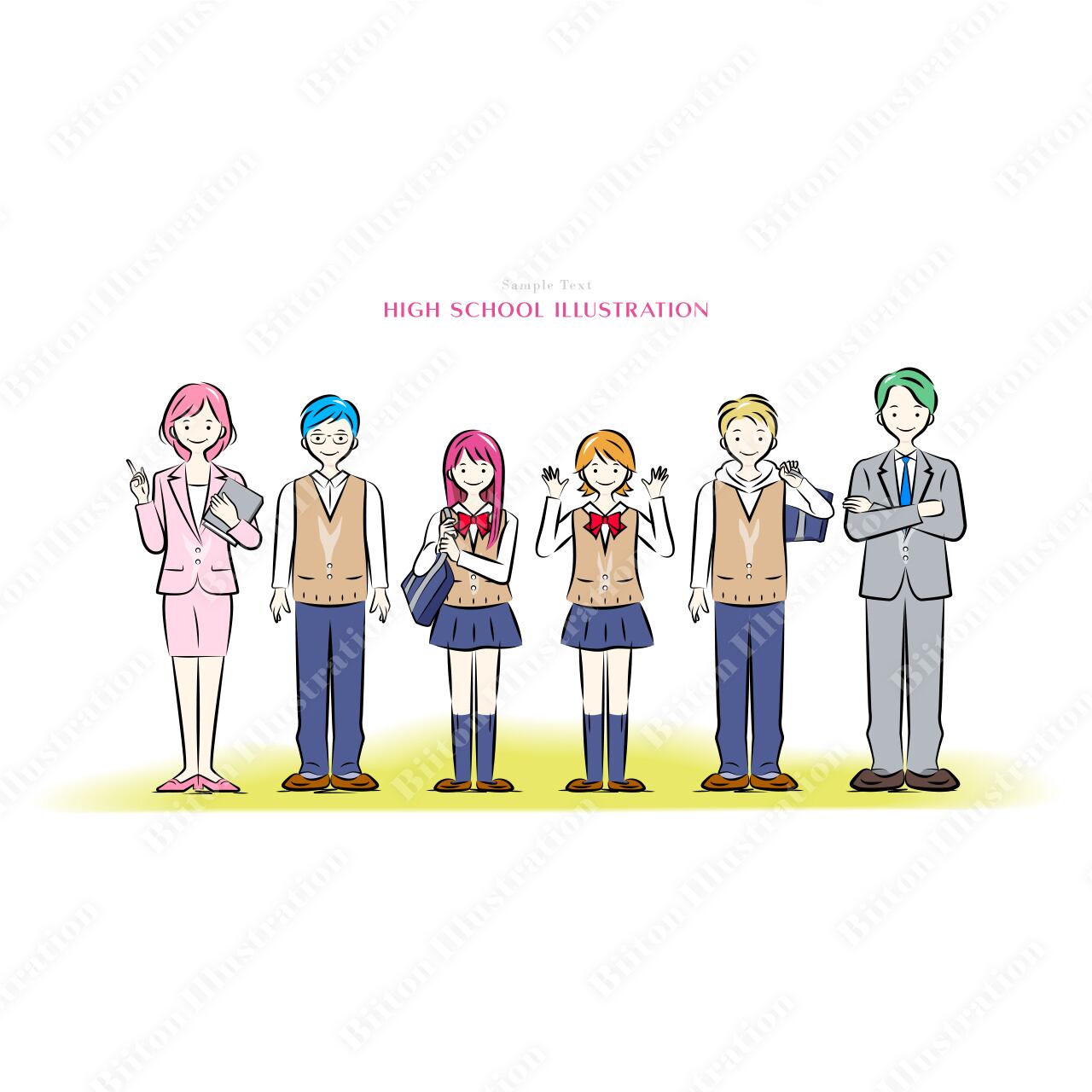 Adobe illustratorで描いた商用フリーのイラスト素材。スクールライフ・生徒と先生たちの学校生活|中学・高校シリーズの全員集合イラスト。