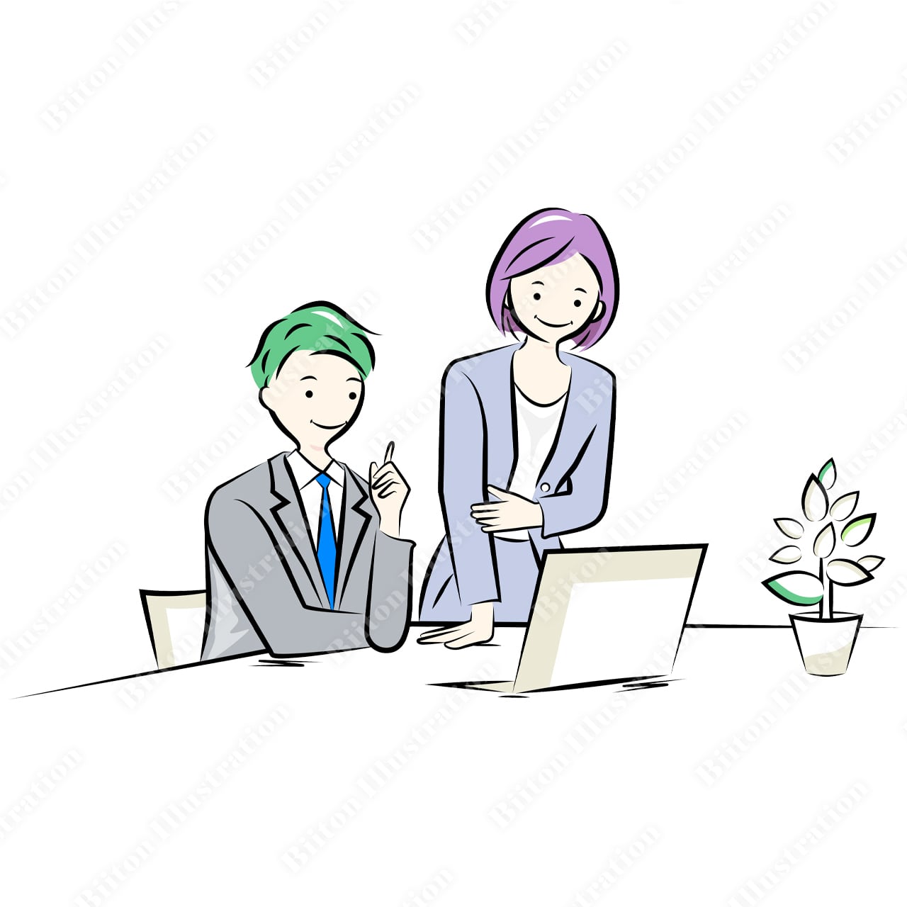 Adobe illustratorで描いた商用フリーのイラスト素材。パソコンを見ながら打ち合わせするビジネスパーソン達|ビジネスイラストシリーズ。
