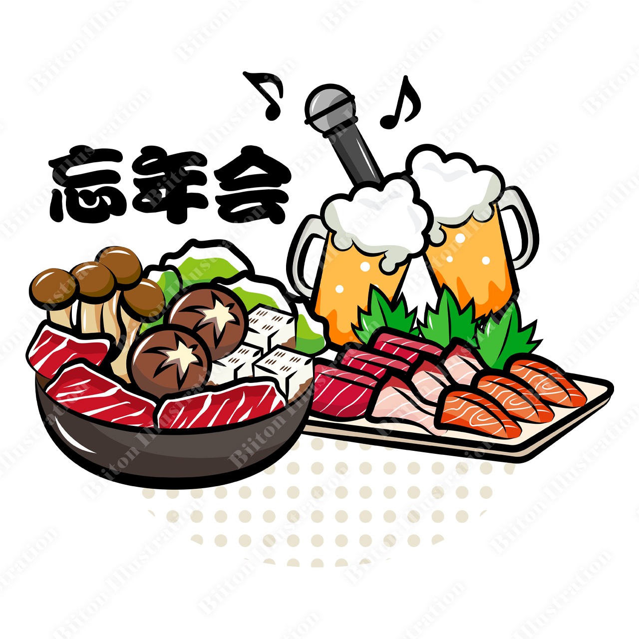 Adobe illustratorで描いた商用フリーのイラスト素材。忘年会|使える季節行事素材シリーズ(冬)|ポップなワンポイントイラスト。