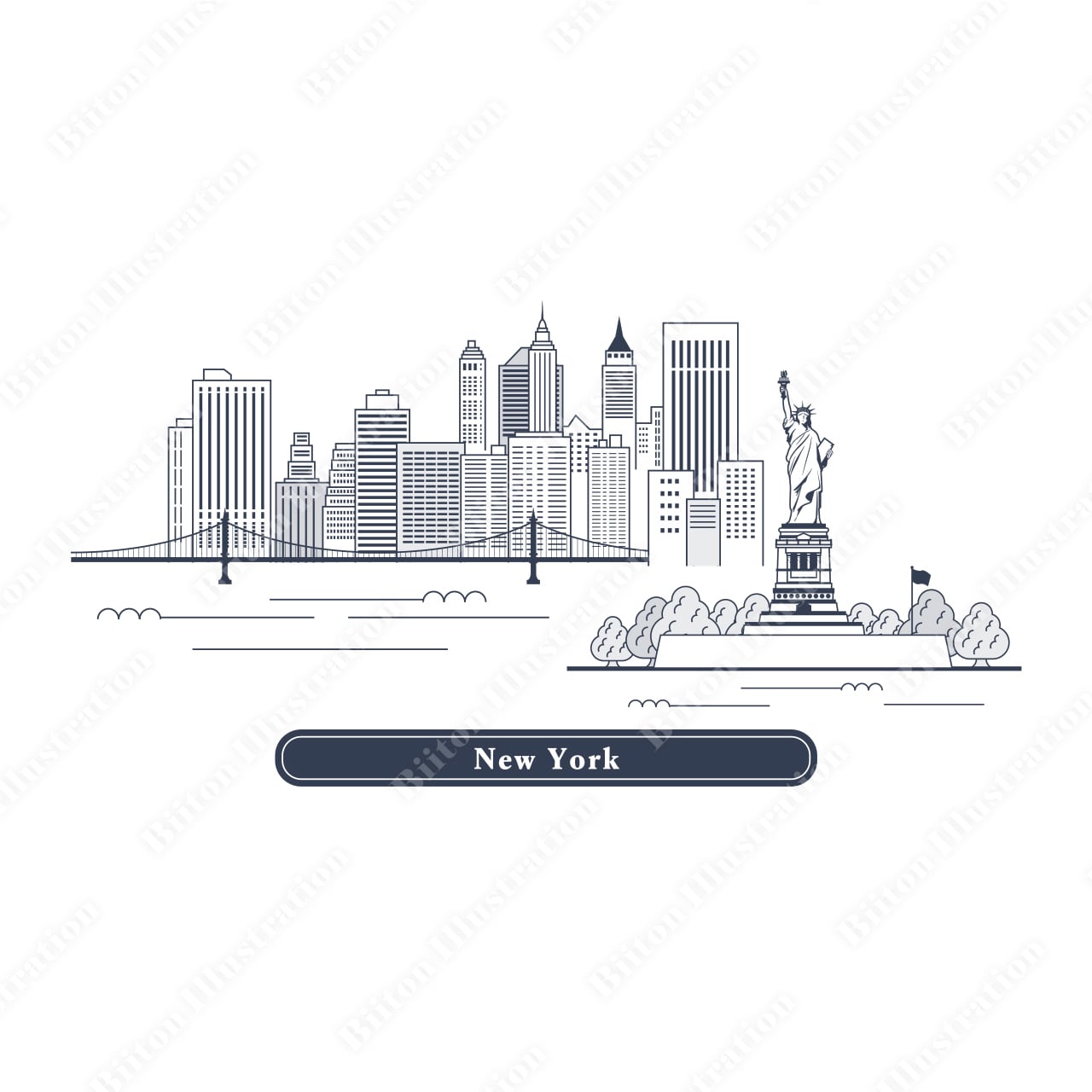 Adobe illustratorで描いた商用フリーのイラスト素材。世界最大級の都市で、ファッション、芸術、経済の発信地!夢が広がる都市ニューヨークの街並み線画イラストです。