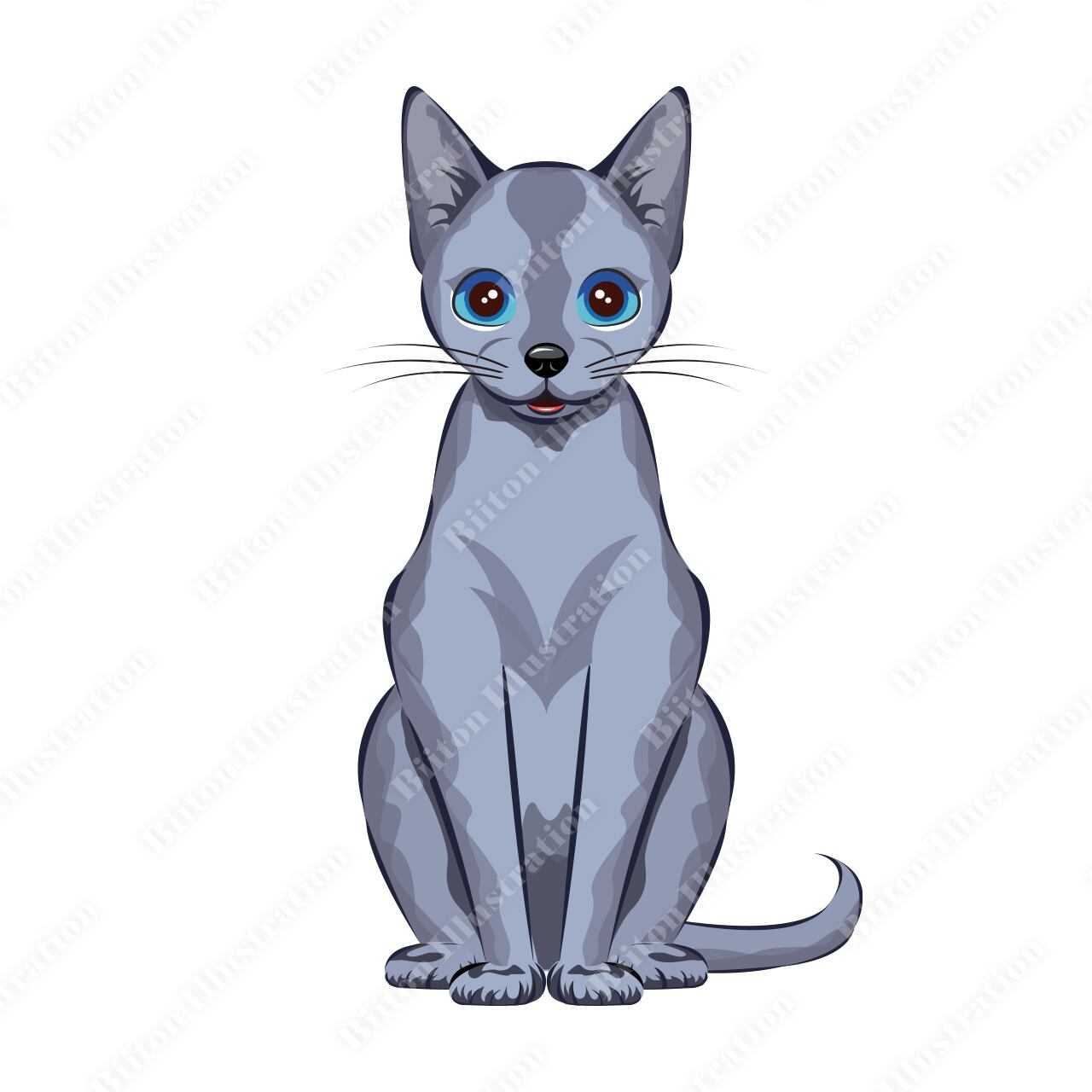 Adobe illustratorで描いた商用フリーのイラスト素材。ブルーグレーの毛並みとエメラルドグリーンの大きな目が美しいロシアンブルーのイラストです。