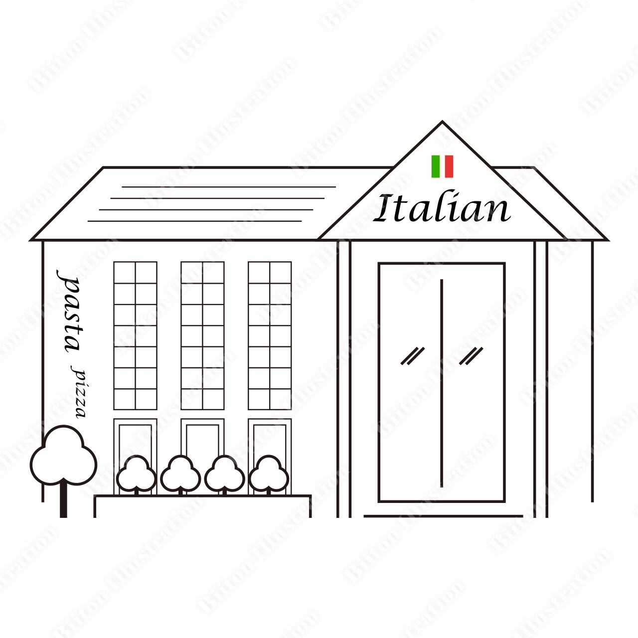 Adobe illustratorで描いた商用フリーのイラスト素材。イタリアンレストラン|お店の外観をイメージした線画イラストシリーズです。