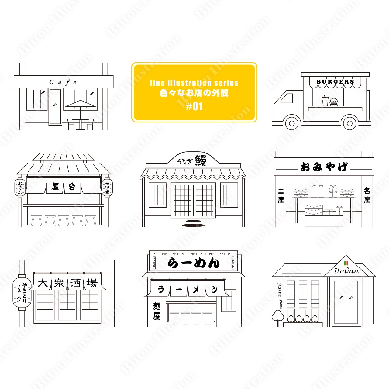 Adobe illustratorで描いた商用フリーのイラスト素材。色々なお店(カフェ・キッチンカー・屋台・うなぎ屋・お土産屋・居酒屋・ラーメン屋・イタリアンレストラン)の外観をイメージした線画イラストセットです。