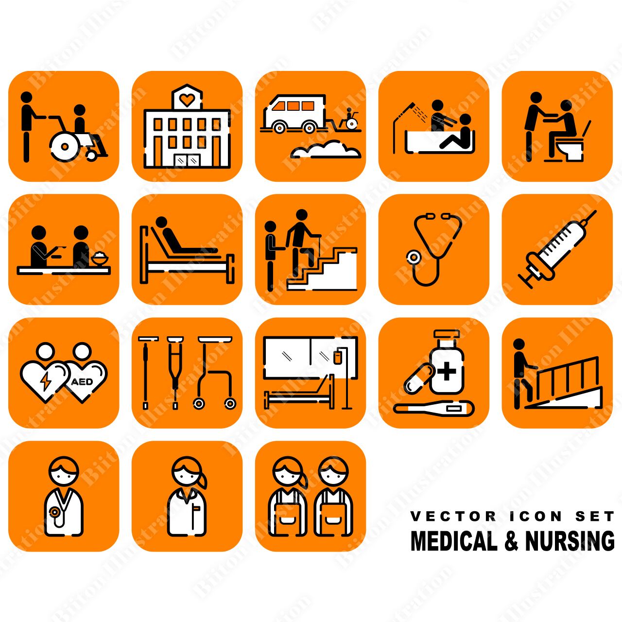 Adobe illustratorで描いた商用フリーのイラスト素材。介護と医療のベクターアイコンセットです。