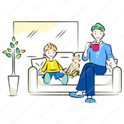 Adobe illustratorで描いた商用フリーのイラスト素材。リビングのソファでくつろぐ親子(パパ,子ども,猫)|家族シリーズ。