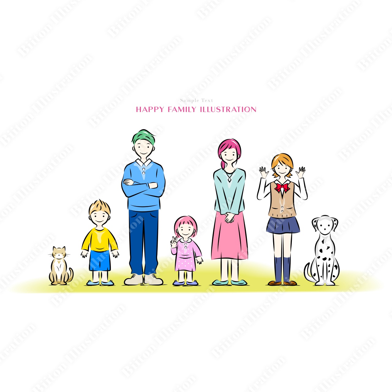 Adobe illustratorで描いた商用フリーのイラスト素材。幸せ家族集合|夫婦2人と3人の子供たちと猫と犬。