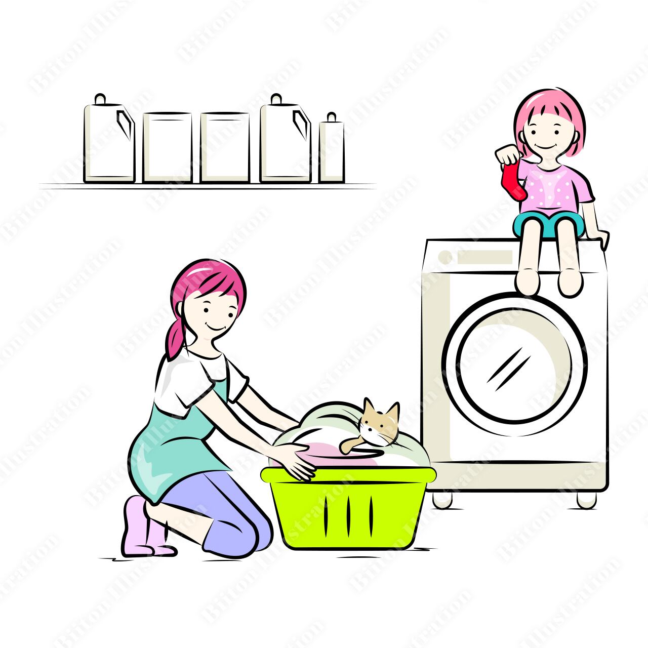 Adobe illustratorで描いた商用フリーのイラスト素材。洗濯をする主婦(ママ)と女の子(娘),猫|家族シリーズ