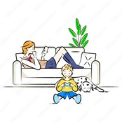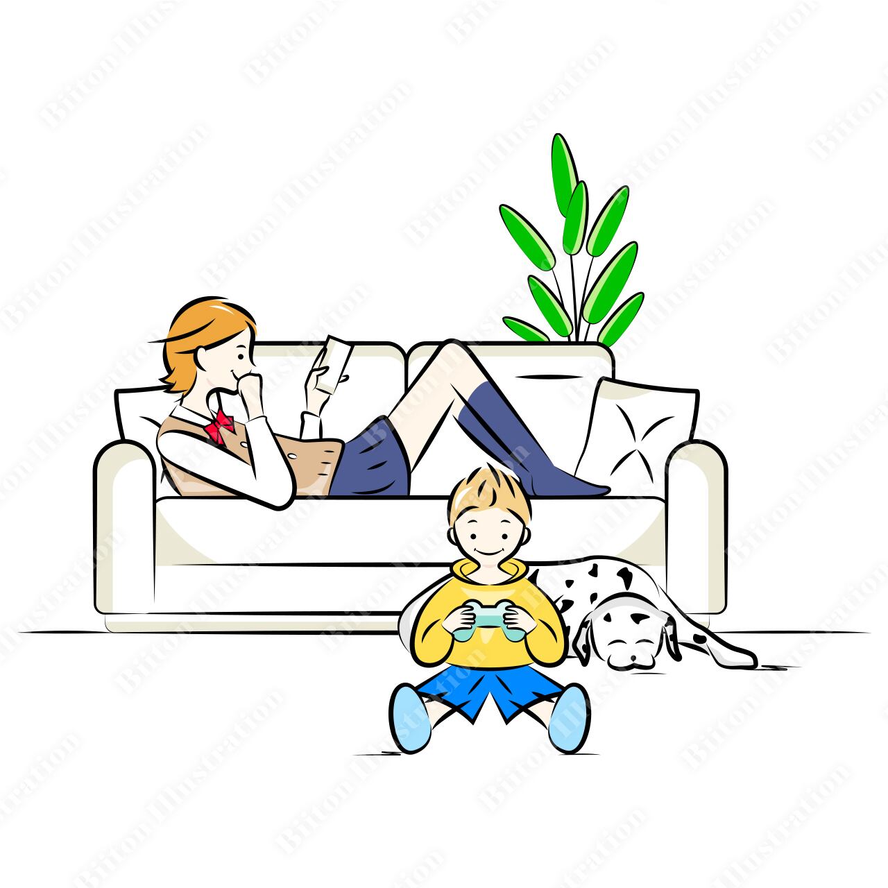 Adobe illustratorで描いた商用フリーのイラスト素材。リビングのソファでスマホを見る女子高生(姉)とゲームをする男の子(弟),犬のダルメシアン|家族シリーズ