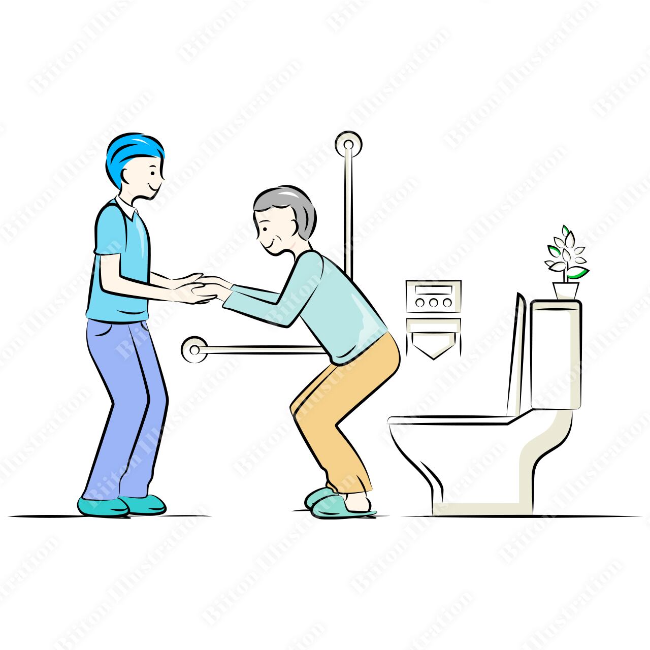 Adobe illustratorで描いた商用フリーのイラスト素材。高齢男性のトイレ介助を手伝う介護ヘルパー|介護看護シリーズ