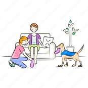 Adobe illustratorで描いた商用フリーのイラスト素材。高齢女性の靴下の着替え介助を手伝う介護ヘルパーと介助犬(レトリバー)|介護看護シリーズ
